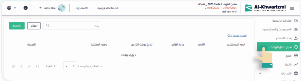 يُمكِّنك النظام من عرض سجل تناقل بيانات الباحثين وحالة مزامنتها، والنسخة التي يعملون عليها في العمل الميداني، حيث تكون هذه المعلومات مفيدة لمتابعة نجاحهم في نقل البيانات وتحميلها عند اتصالهم بالإنترنت، ولعرض السجل اتبع الخطوات التالية: