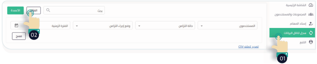 - يمكنك البحث عن مستخدم محدد ضمن سجل تناقل البيانات بكتابة اسمه في صندوق البحث