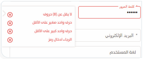 تظهر الرسالة عند اختيار كلمة مرور لا تخضع لشروط النظام في صياغة كلمات المرور عند إضافة مستخدم جديد.
