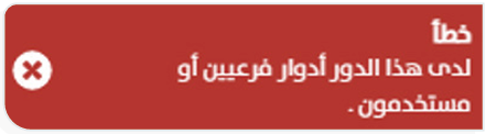 تظهر الرسالة عند محاولة حذف دور تم منحه لمستخدم أو تم إدراج أدوار تابعة له.