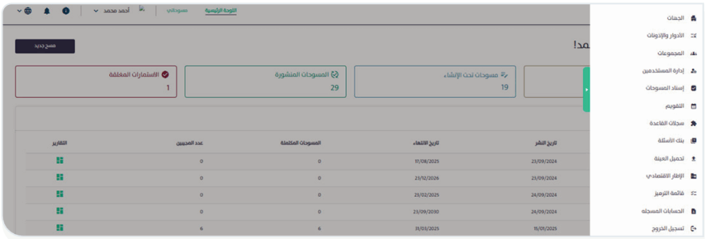 قائمة التحكم هي مجموعة من خيارات التحكم التي تتيح إدارة نظام المسوحات وتنظيم الجهات والأدوار، ومجموعات المُستخدمين الذين ستوكل إليهم مهمة إدارة المسوحات، بما يشمل إسناد المهام إليهم، وعرض التقويم الزمني للمسوحات، وإثراء بنك الأسئلة، كما توفر القائمة أدوات سهلة لتنفيذ العمليات المختلفة، مثل: إضافة البيانات، وتعديلها، أو حذفها، مع خيارات للبحث السريع وتنظيم عينات المسوحات.