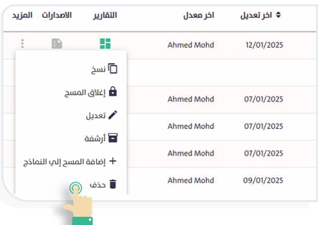 - اختر المسح الذي ترغب بحذفه من جدول المسوحات.