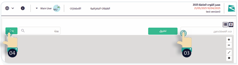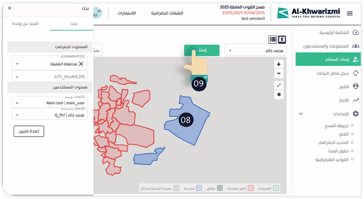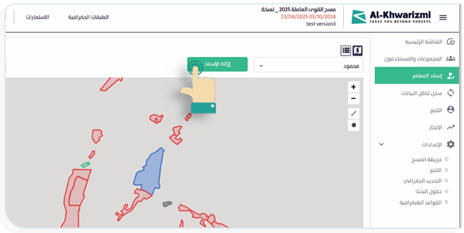 يتم من خلال “إسناد المهام” تحديد المستخدم المسؤول عن متابعة كل استمارة باستخدام الخريطة لتحديد المناطق المسؤول عنها كل باحث لتسهيل عملية جمع المعلومات وتنظيمها، ولاختيار المنطقة وتعيين مستخدم لها باستخدام الخرائط اتبع الخطوات التالية: