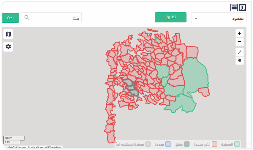 - عند استكمال خيارات البحث، ستظهر لك خريطة محددة باللون الأحمر إشارة إلى عدم إسنادها بعد لأي مستخدم، كما في الصورة التالية: