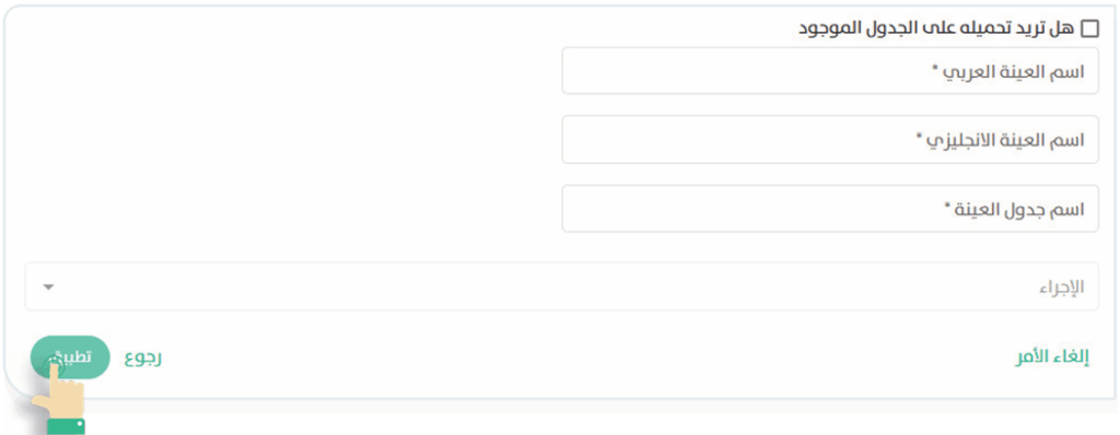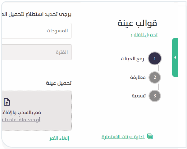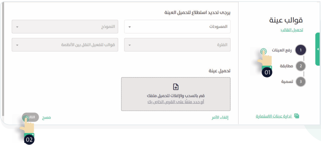 حدد كل من المسح، والنموذج والفترة لتحميل العينة، ثم حمِّل العينة من جهازك حسب القالب الذي تم تعبئته مسبقاً، ثم اضغط على “التالية”