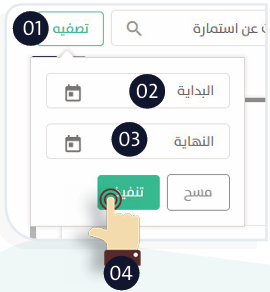- يمكنك عرض استمارات حسب فترة زمنية محددة، بالضغط على “تصفية”، ثم اختر تاريخ بداية وانتهاء الاستمارة، واضغط “تنفيذ”.