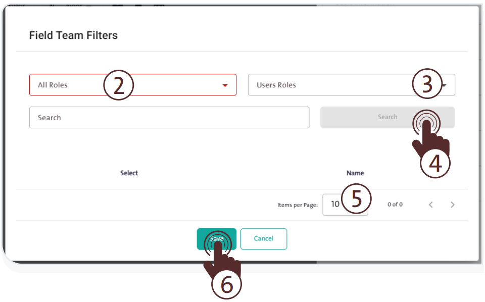 - Choose “Field Team Filters” A window will pop up; select the role and user roles, then click “Search”