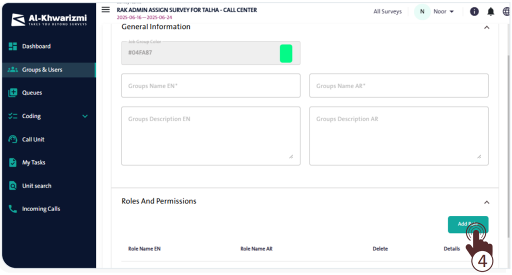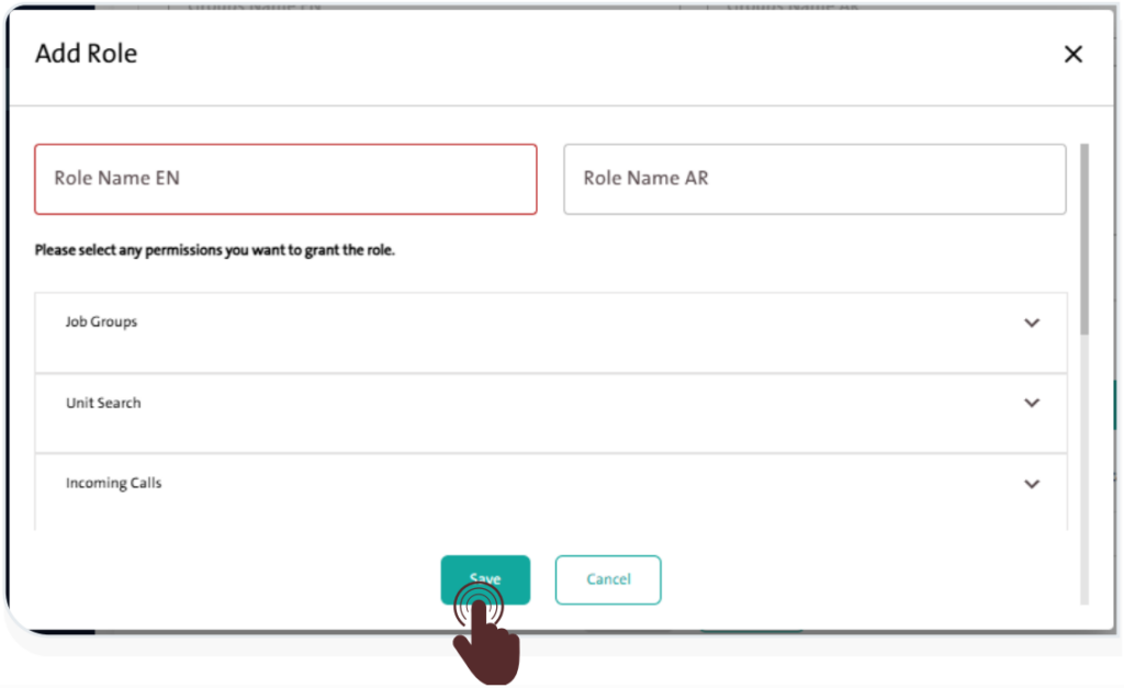 – Enter the role name in English and Arabic in the designated fields.
