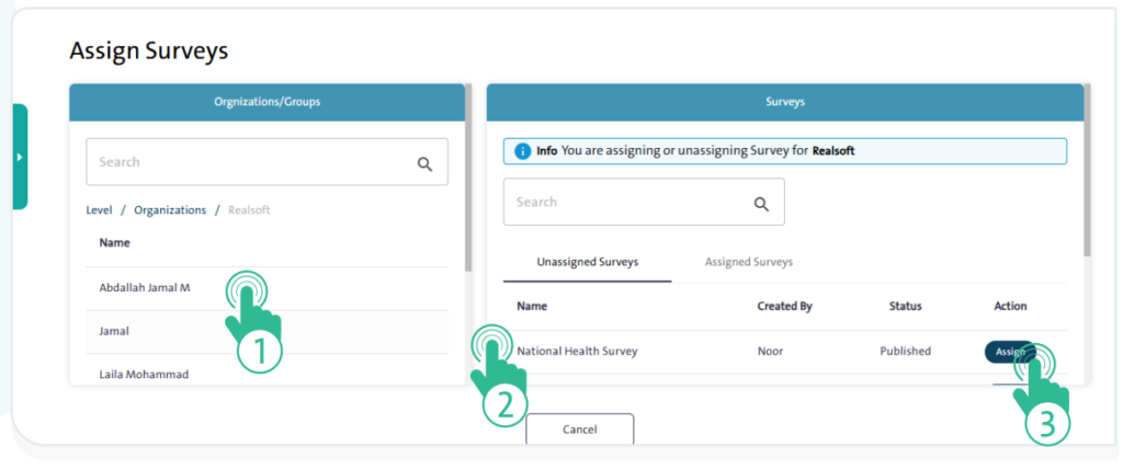 - From the “Surveys” tab, select the survey you want to assign to the user.