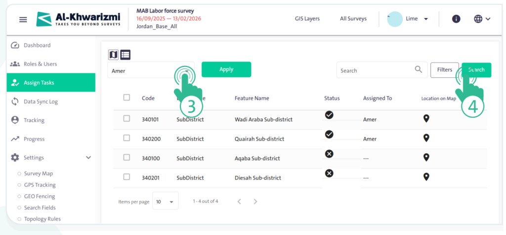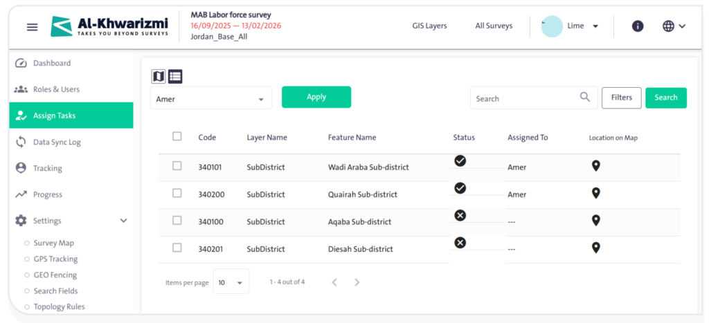 Through “Task Assignment”, you can define the user responsible for monitoring each survey using the list, by assigning the areas that each researcher is accountable for. This helps facilitate and organize the data collection process.
