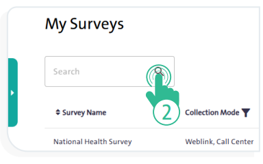 - Type the survey name or part of it in the search box, then click the “Search” icon . The results will be displayed in the surveys table below.