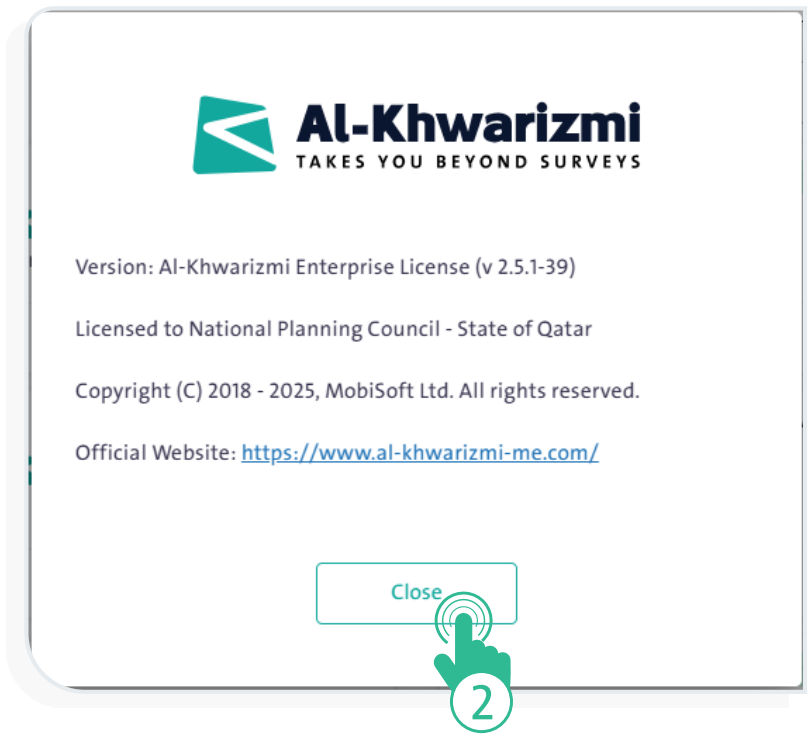 at the top of the screen; a window will pop up displaying details about the Al-Khwarizmi Platform, including: